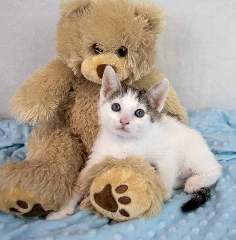 • LIKES/DISLIKES: I’m all about fun and snuggles — especially both at once. I love curling up with my siblings on your lap for cozy cat naps (that’s the best kind of nap, if you ask me). But when I’m not snoozing, I’m on the move! I love chasing toys across the floor and leaping high to catch dangly things — fish, mice, fuzzy balls, ribbons — you name it, I’ll jump for it! The cat tree is my playground and my favorite nap spot. I climb, play, hide, and then flop down for a good sleep right on the top perch. / I’m a young kitten, so sudden noises (like the icemaker) startle me initially, but I get used to unfamiliar noises pretty quickly. Otherwise, I can’t think of any dislikes since I am a kitten, but I would not be happy if I did not get the love and attention all kitties deserve!
