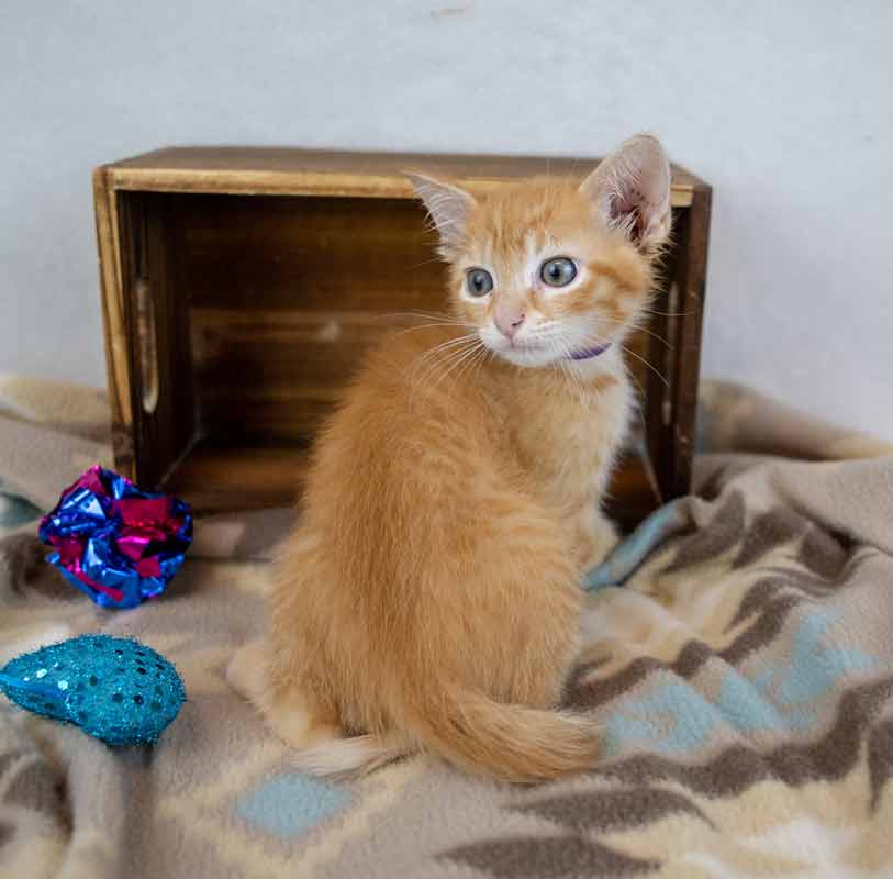 • LIKES/DISLIKES: I like snuggles and cuddles, and – of course, kitten toys! My siblings and I enjoy playing and frolicking, and I just KNOW I will love doing so in my new home, too. / I can’t think of any dislikes since I am a kitten, but I would not be happy if I did not get the love and attention all kitties deserve!