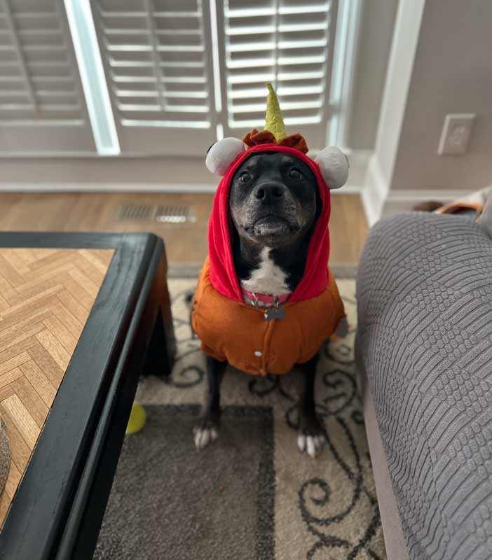 • MEDICAL: I'm current on vaccinations, micro-chipped and spayed. I have some skin irritation so I’m taking an allergy medication called Zenrelia which I may or may not need to stay on - just ask about that. I sometimes have phantom pains in my tail since it had to be amputated. These can be common with amputees and should decrease in time. I may need to be muzzled for vetting.