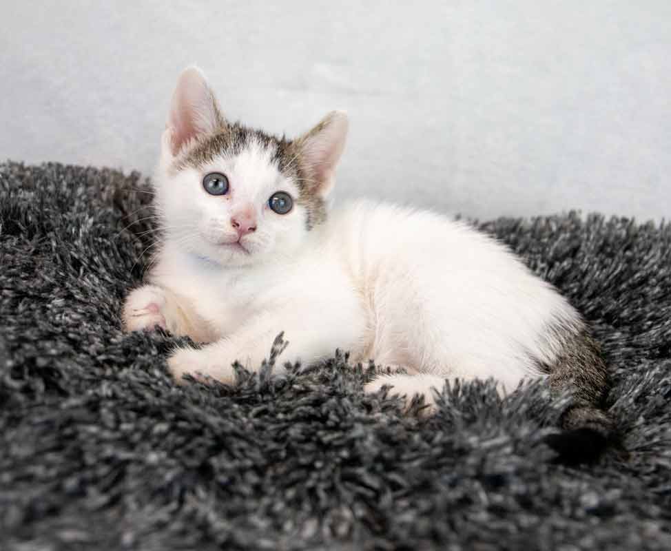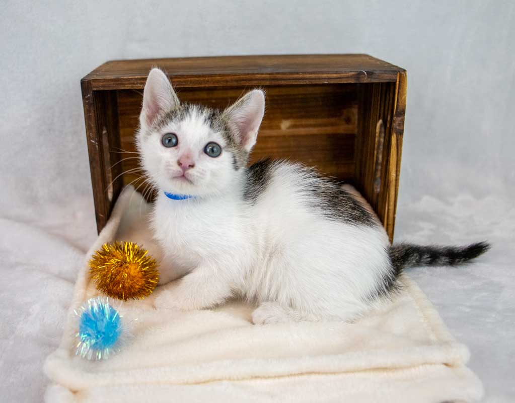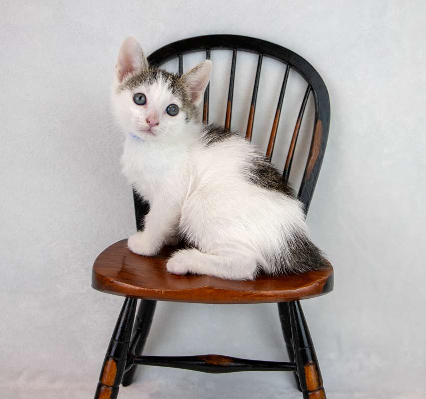• LIKES/DISLIKES: I’m all about fun and snuggles — especially both at once. I love curling up with my siblings on your lap for cozy cat naps (that’s the best kind of nap, if you ask me). But when I’m not snoozing, I’m on the move! I love chasing toys across the floor and leaping high to catch dangly things — fish, mice, fuzzy balls, ribbons — you name it, I’ll jump for it! The cat tree is my playground and my favorite nap spot. I climb, play, hide, and then flop down for a good sleep right on the top perch. / I’m a young kitten, so sudden noises (like the icemaker) startle me initially, but I get used to unfamiliar noises pretty quickly. Otherwise, I can’t think of any dislikes since I am a kitten, but I would not be happy if I did not get the love and attention all kitties deserve!