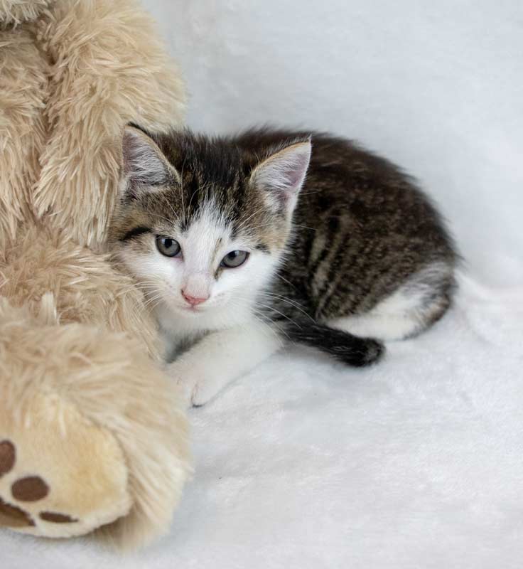 • OTHER CATS/DOGS/KIDS: I get along well with my sibling, and I am quite tolerant of his AMAZING energy. I may enjoy another kitty in my new home. If you have a nice kitty at home who may enjoy a kitten friend, we would likely be pals. / I took a while to warm up to the dog in my foster home, but I learned to accept him, his sniffing and even licks. I even sassed him back when he accidently scared me by jumping on the bed without his usual warning. It likely will depend on the dog, but if you have a kitty-friendly doggie at home, we can probably be pals. / Children in my new home may be nice, but best they are gentle and know how to handle a kitten. Small children seem a bit much for me at first, but I’ll come out of hiding to play. If they are too rambunctious, I just avoid them. Slightly older kids (age 6-8) would be the best match and – of course, let’s meet!