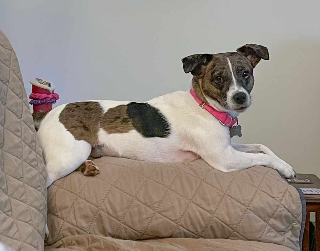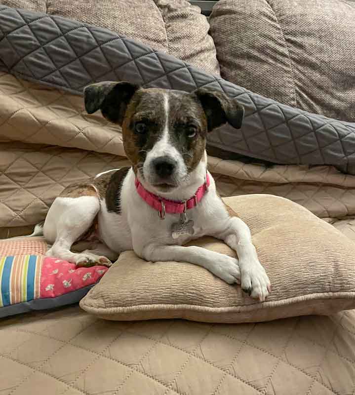 • PERSONALITY/ENERGY LEVEL: The volunteers took things slowly with me initially and now my wonderful nature has blossomed! I’m described as fun, playful and super sweet and I know you will love my friendly nature. I can be a goofy girl and frequently put a smile on the volunteers’ faces. I’m also alert to my surroundings and can be a barker when my family is not home, so best no apartment or condo-type home please. Though in general when my family is home, I don’t bark much unless I see a deer or hear a strange noise at my foster’s house. The shelter environment makes me a tad nervous, and I’ve shown some reactivity and guarding behaviors which are easily corrected, and my trainer will be happy to go over this with you. I also nipped at a temporary foster that got too close to my face as I don’t like that. I was a well-mannered little girl for my bath and did great for my nail trim, too. / My energy level is 6-8. Typical of my Jack Russell breed, I would do best in a home with a fenced-in yard, where I can run and burn off my energy.
